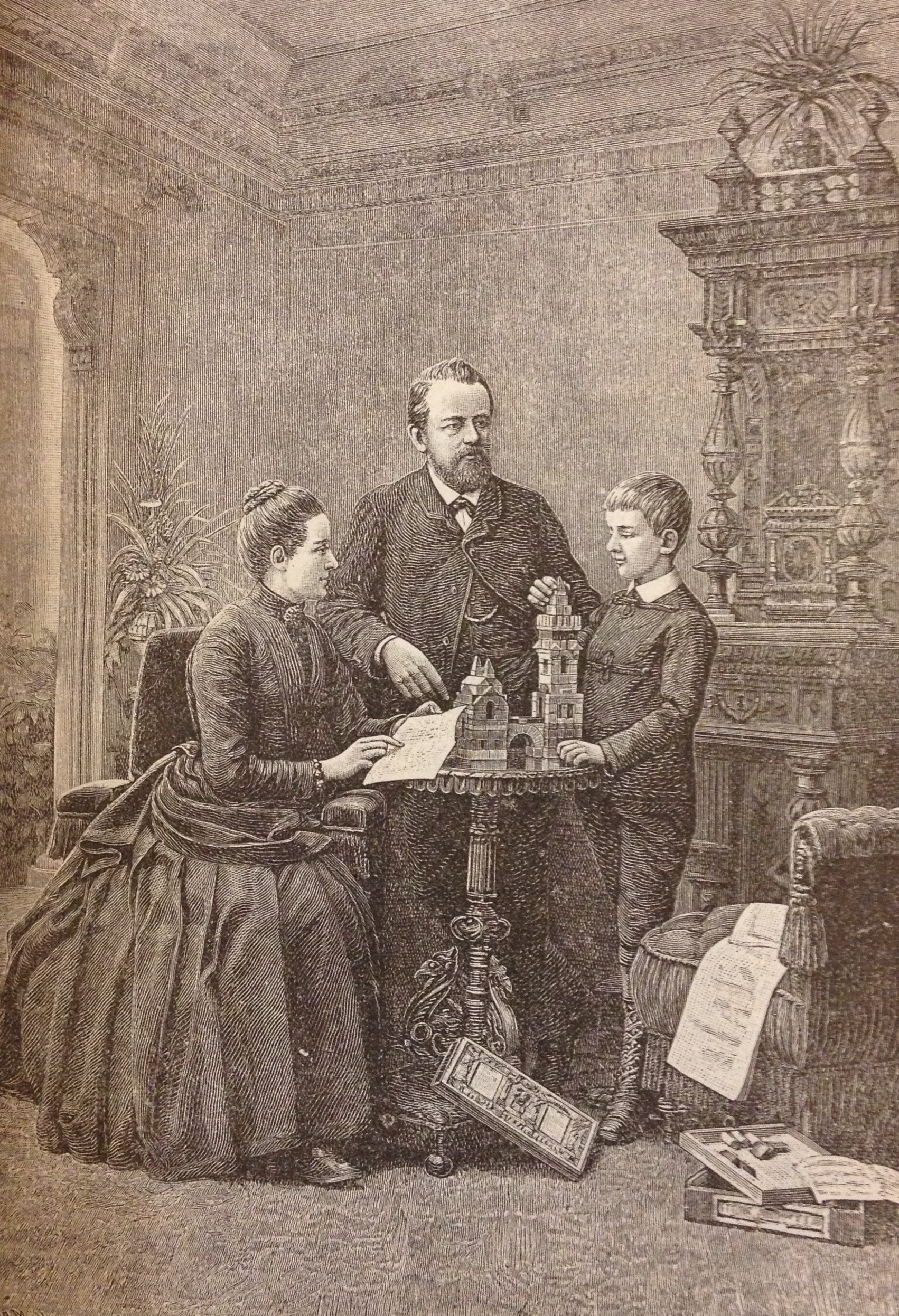 A late nineteenth-century promotional leaflet of the German Anker-Richter company, the world market leader in construction sets during that period, shows a remarkable family scene set in a meticulously decorated bourgeois living-room. A well-dressed boy is standing in front of a small table, adding the last touches to a building made of Anker-Richter blocks. He is concentrated and serious, as if performing an important homework. The mother is sitting opposite to him, looking at him intensely, while her finger points at a page of the play manual. She appears to be supervising him, making sure that he follows the instructions correctly. The father is standing between them, apparently adding his authority to the scene, without direct involvement. The packaging of the blocks and relevant manuals are lying on an armchair and on the floor, providing the only casual detail in a setting otherwise carefully structured, exuding an atmosphere of discipline and order that is far from playful or pleasurable. The illustration was actually based on a photograph sent by the pictured father himself, Mr. Robert Roesler of Stockholm, who stated: [The Anker-Richter box] ‘has caused great enjoyment not only to my little son but also to my wife and myself. […] No other game has given my boy so much pleasure […] He is never tired of it, he commences building again and again and is already to some extent skilled in this art’.i The description is rather at odds with the somber atmosphere of the picture.