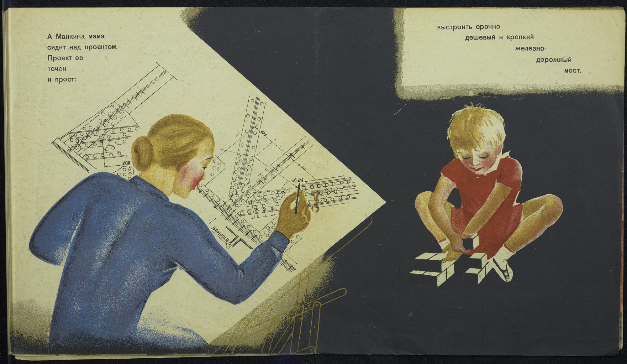 In the Soviet Union, the disciplined child, as opposed to the ‘wild’ and ‘dangerous’ one, served as an agent of a luminous, utopian Soviet future, a future that would be homogeneous, prosperous, and modern at the same time. Obedient and uniformly behaving children conformed to the ideals of a standardised, industrial society. Building blocks were used as a model and metaphor for building this new society through engineering expertise and hard work. Childhood was a social construct; play-related iconography from the Soviet Union illustrates the ways adults co-opted children according to the dominant Communist paradigm. Nina Sakonskaia’s book Mamin Most (Mother’s Bridge), published in 1933, is an illuminating example of how construction toys were embedded in political narratives. The woman ‘hero’ of this book is an engineer who works to design a bridge. Her little girl is shown sitting on the floor beside her, playing with building blocks. As the mother is busy creating a complicated, innovative technical structure, so is the girl absorbed in building something new on the small scale.